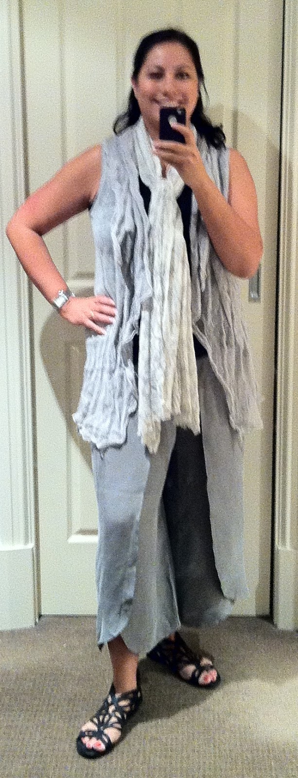Friday was another lovely, warm day and I can almost feel summer in the air! Black cupro pants and black sleeveless long vest from Flower, with a black tank underneath. I wore a long art deco style bronze and black necklace from Ann Taylor, with a stack of gold bangles from Gap. Same bag as Thursday, with my super comfy Nine West black gladiator flats.